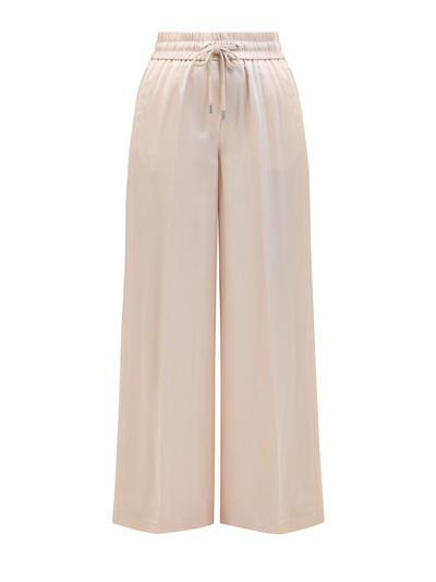 Элегантные брюки-палаццо в жемчужно-бежевом оттенке от Peserico. Модель создана из металлизированной ткани на основе вискозы и шерсти с сатиновым блеском, струящийся материал идеально подходит для создания повседневных и вечерних образов. Высокий эластичный пояс с регулируемой кулиской визуально моделирует силуэт. Детали: прорезные карманы, заложенные складки. Сделано в Италии.