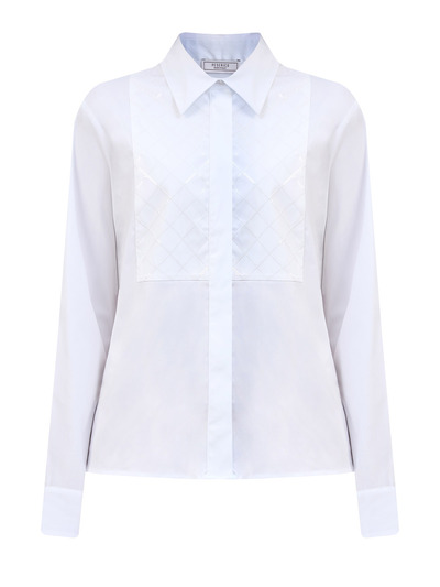 Элегантная женская рубашка от Peserico создана из гладкого хлопкового поплина — выверенный состав с эластичными волокнами обеспечивает максимальный комфорт в движении. Декоративная манишка с геометрическим узором из вплетенных полупрозрачных пайеток подчеркивает расслабленный стиль изделия. Детали: закругленный нижний край, потайная застежка на пуговицы из перламутра, отложной ворот. Сделано в Италии.