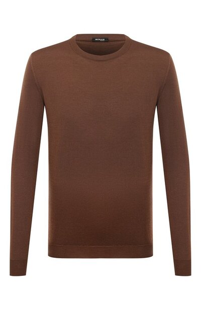 Для создания джемпера с неглубокой круглой горловиной выбрали тонкий трикотаж из кашемира и шелка. Широкий пояс и манжеты связали резинкой. Лаконичная модель приталенного кроя сочетается и с офисными, и с повседневными брюками.