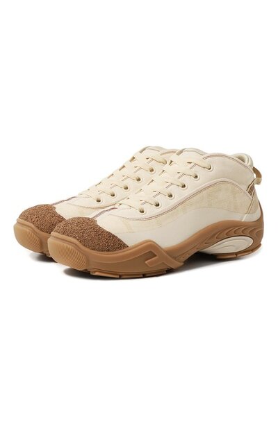 Кроссовки Lab изготовили из текстиля с узором Fendi Shadow, который выполнили лазером. Для отделки сзади использовали замшу, а мыс украсили вставкой из пробковой коры. Модель дополнили скульптурной каучуковой подошвой с эмблемой марки.