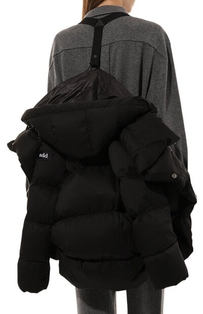 Стеганый пуховик свободного кроя сшили из водоотталкивающего полиэстера. Модель с регулируемым капюшоном дополнили двумя боковыми карманами снаружи и одним внутри, у которого предусмотрели систему защиты от электромагнитных волн. Изделие застегивается на молнию и кнопки. В комплекте — внутренние лямки.