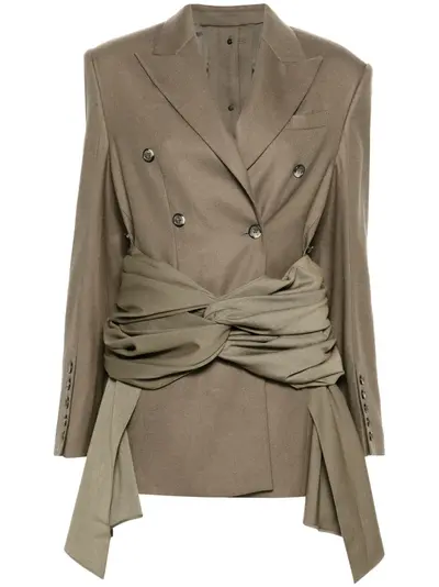olive green wool blend peak lapels shoulder pads long sleeves with buttoned cuffs chest welt pocket detachable belt two front flap pockets rear slit double-breasted button fastening and rear button fastening