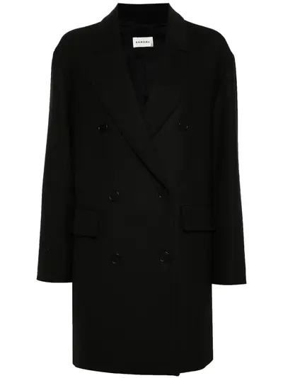 black twill weave peak lapels long sleeves two front flap pockets central rear vent straight hem full lining double-breasted button fastening