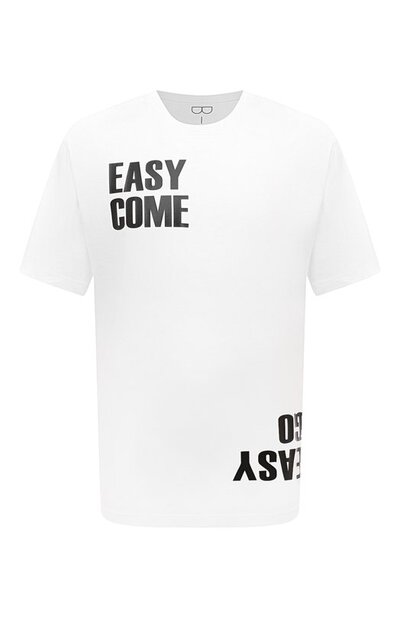 Для создания свободной футболки с чуть спущенной линией плеч выбрали хлопковый трикотаж. Спереди напечатали зеркальные надписи Easy Come и Easy Go. Круглую горловину отделали эластичным кантом.