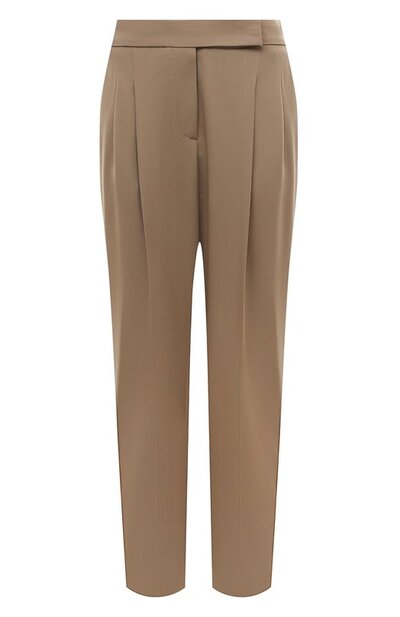 Брюки с защипами, переходящими в стрелки, будут органично смотреться и в офисе, и на прогулке в городе. Модель с четырьмя карманами и эластичной вставкой на поясе сзади сшили из тонкого шерстяного твила.