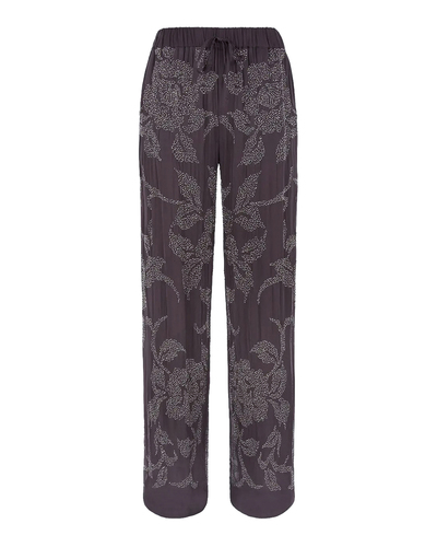 Брюки P.A.R.O.S.H. из тонкой вискозы серого оттенка расшиты стеклярусом. Модель прямого силуэта с широкими брючинами и широкой эластичной линией пояса с завязками.