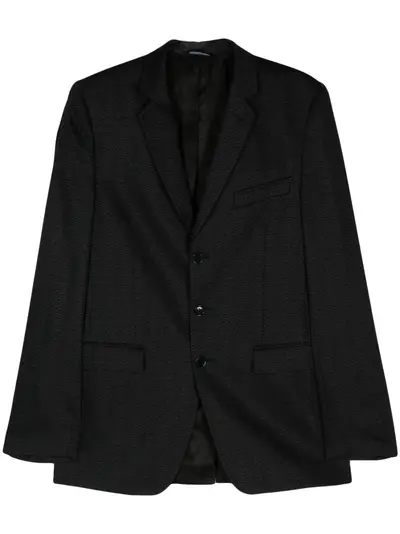 circa 2000s black wool blend patterned jacquard notched lapels front button fastening shoulder pads long sleeves with buttoned cuffs chest welt pocket two front flap pockets American rear vent full lining Condition: GOOD. This previously owned and used item is in good condition with minimal signs of use. This may include fading of material or plating and scratches.