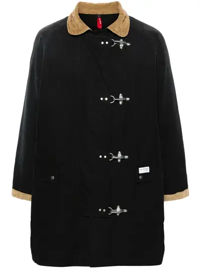 prussian blue cotton padded design canvas suede panelling concealed press-stud fastening carabiner fastening corduroy collar long raglan sleeves two side flap pockets leather tag quilted lining straight hem