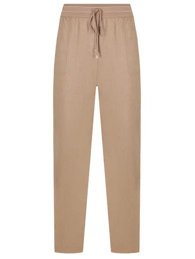 -Бежевые брюки из тонкой шерсти от LORENA ANTONIAZZI. -Модель полуприлегающего силуэта со стандартной посадкой, эластичным поясом на кулиске, карманами по бокам и сзади. -Брюки дополнят повседневные образы с базовым трикотажем и утепленными кедами.