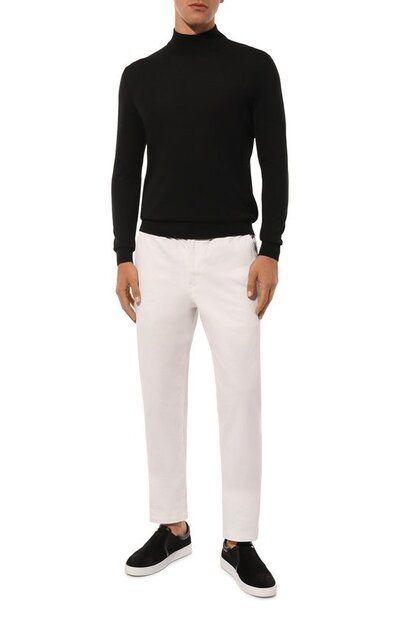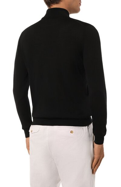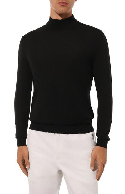 Облегающая водолазка одинаково гармонично смотрится и с джинсами, и с костюмными брюками. Для изготовления модели с высокой горловиной, дополненной широким отворотом, использовали шерстяную пряжу.