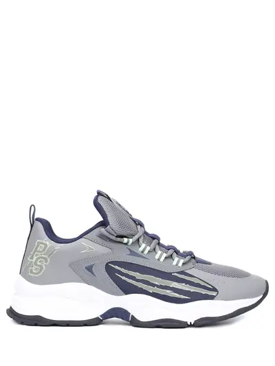 -Серые комбинированные кроссовки из текстиля и полимера от PLEIN SPORT. -Модель с закругленным прорезиненным мысом, легкой блочной подошвой, функциональной шнуровкой, логотипами бренда на язычках и задниках, внутренней отделкой из текстиля.