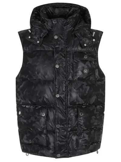 -Черный стеганый жилет с камуфляжным принтом от PHILIPP PLEIN.