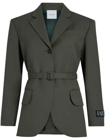 dark green virgin wool/organic cotton logo patch at the sleeve detachable waist belt notched lapels front button fastening chest welt pocket two side flap pockets long sleeves