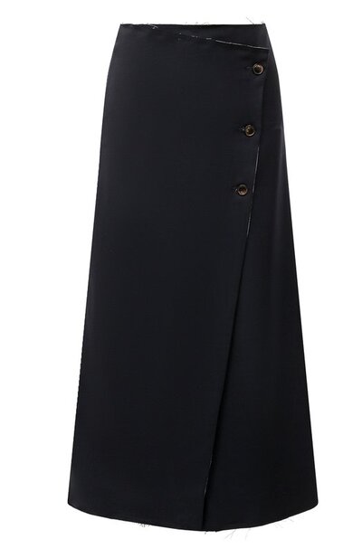 Шерстяная юбка с запахом и асимметричной застежкой на пуговицы представлена эксклюзивно в ЦУМе. Выступившие нити на необработанных краях модели придают ей нарочито неформальный вид.