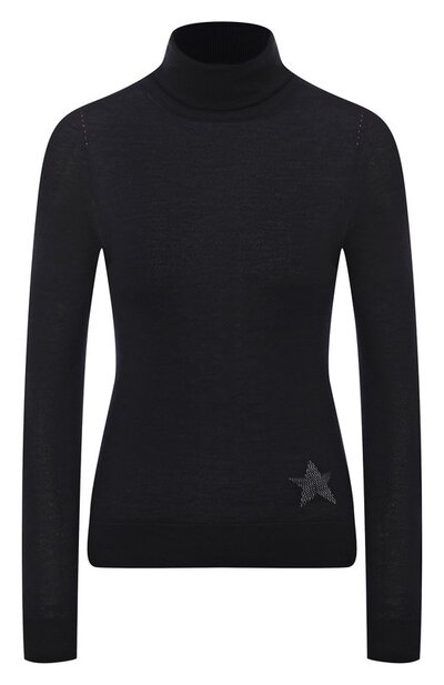 Лаконичная водолазка с высокой горловиной выполнена из тонкого смесового трикотажа на основе кашемира с добавлением шелка. Слева внизу облегающая модель декорирована знаковой для марки звездой из люрексовой нити.