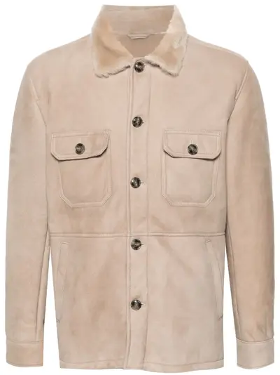 taupe leather front button fastening shearling collar two chest patch pockets long sleeves buttoned cuffs two side slit pockets central rear vent shearling lining straight hem