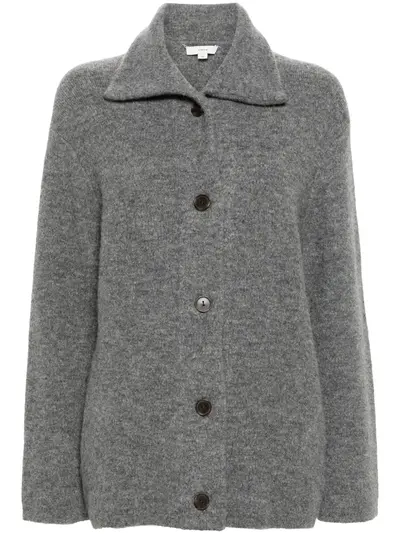 medium grey ribbed knit brushed effect mélange effect front button fastening spread collar drop shoulder long sleeves slip pockets to the sides unlined straight hem