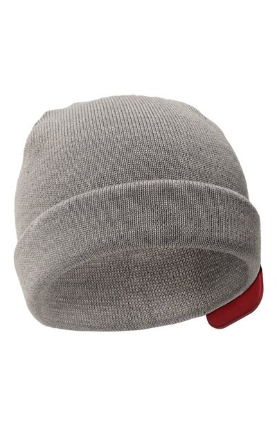 Двухслойная шапка из шерстяной пряжи хорошо защищает от ветра и холода. Единственным декором аксессуара стала брендированная полимерная накладка на отвороте, имитирующая антикражную бирку.