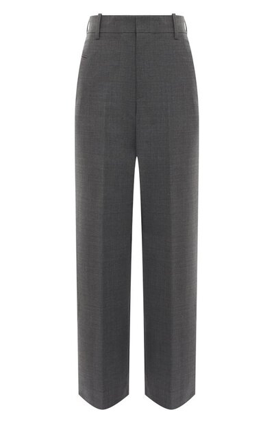 Правый задний карман свободных брюк удлинили так, что он пересекает боковой шов. Слева модель со стрелками дополнили незаметным врезным карманом. Изделие с высокой посадкой сшили из эластичного микса полиэстера и шерсти первого пострига.