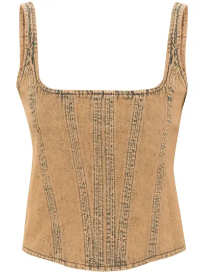 walnut brown cotton denim corset style rear zip fastening U-neck thin shoulder straps vertical seamed straight hem cropped