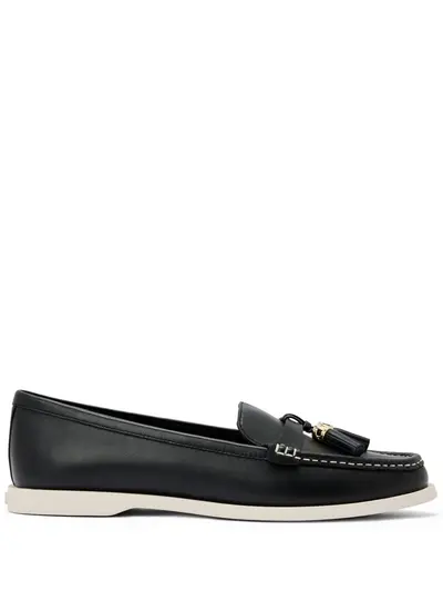 black sheepskin smooth grain contrast stitching tassel detail almond toe branded footbed flat rubber sole