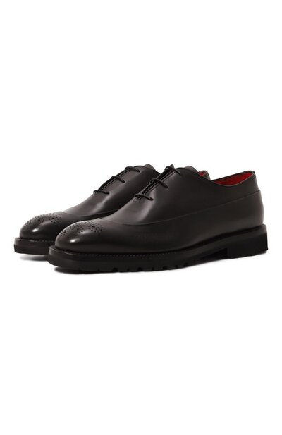 Оксфорды из отполированной телячьей кожи продублировали изнутри мягкой кожей козлика. Туфли с миндалевидным мысом и рельефным швом украсили на союзке перфорированным узором, как у брогов. Подошву дополнили устойчивым протектором.