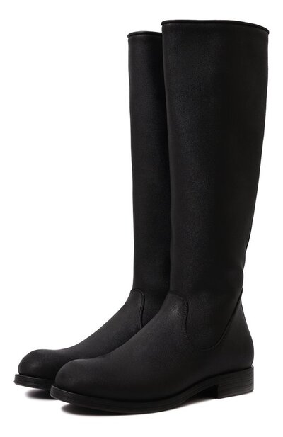 Для пошива высоких лаконичных сапог, напоминающих жокейскую обувь, использовали фактурную матовую кожу. Пара с круглым мысом и широким голенищем застегивается на боковую молнию. Изделие дополнили резиновой подошвой и невысоким наборным каблуком.
