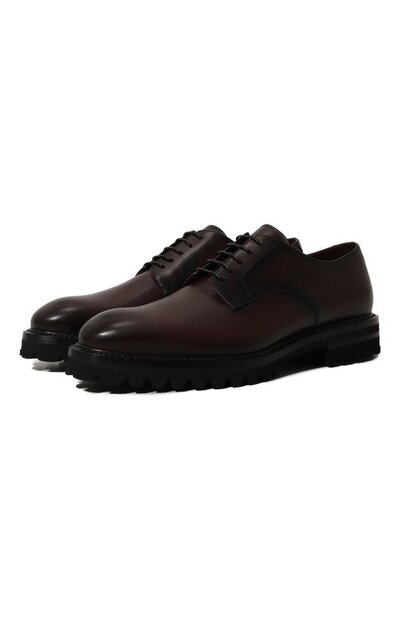 Дерби глубокого бордового оттенка выполнили из отполированной до глянцевого блеска кожи. Подошву с рельефным протектором украсили фирменными полосами. Лаконичная модель идеально подойдет для офисного образа.