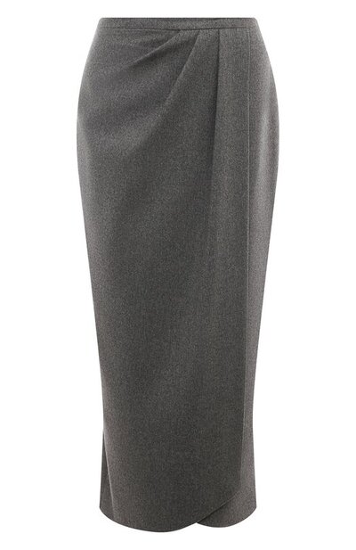 Миди-юбка с имитацией запаха, подчеркнутой драпировкой, органично впишется как в повседневный, так и в более формальный образ. Для пошива модели, застегивающейся на молнию сзади, использовали ткань из кашемира и микрополиэстера.