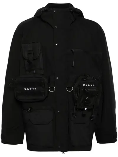 black concealed front press-stud fastening drawstring hood funnel neck embroidered logo to the pockets multiple patch pockets zip-fastening chest pocket two front flap pockets long sleeves hook and loop fastening cuffs mesh lining drawstring hem