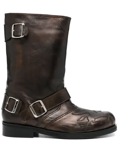 earth brown leather burnished finish Pegasus patch to the front pull-on style mid-calf length decorative buckle detailing stacked heel round toe branded leather insole leather outsole