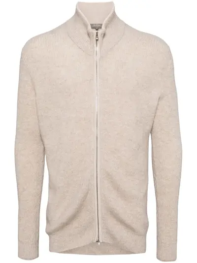 sesame beige organic cashmere fine knit ribbed high neck long sleeves front zip fastening ribbed cuffs and hem