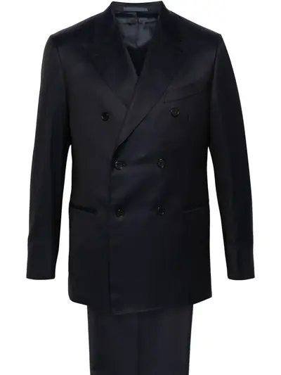 navy blue wool blend vertical stripe pattern set of two Blazer: double-breasted button fastening peak lapels shoulder pads long sleeves buttoned cuffs chest welt pocket two front jetted pockets English rear vents multiple internal slip pockets full lining Trousers: concealed fly and button fastening belt loops pleat detailing two diagonal pockets to the sides two rear button-fastening jetted pockets