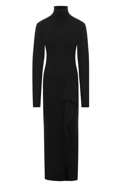 Облегающее миди-платье с высоким воротом и длинными рукавами связали из шерстяной пряжи с добавлением кашемира и эластана. Высокий боковой разрез на подоле подчеркнули широкой драпировкой.