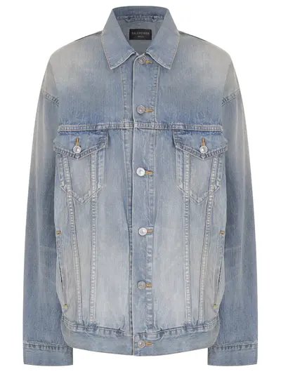 -Голубая куртка-оверсайз из выбеленного хлопкового денима от BALENCIAGA. -Модель свободного кроя со спущенной линией плеча, длинными рукавами с манжетами, четырьмя карманами, отложным воротником, застежкой на пуговицы, крупным принтом на спине.