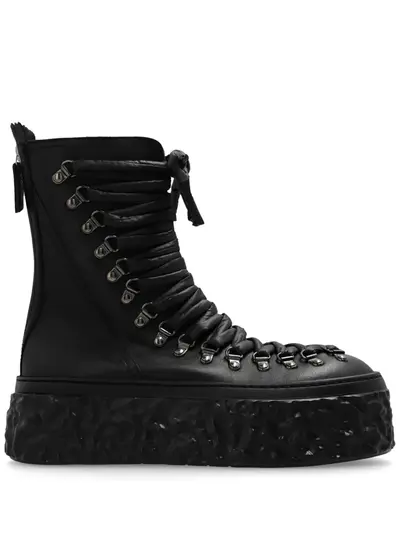 black leather front lace-up fastening rivet detailing round toe rear zip fastening chunky textured rubber sole