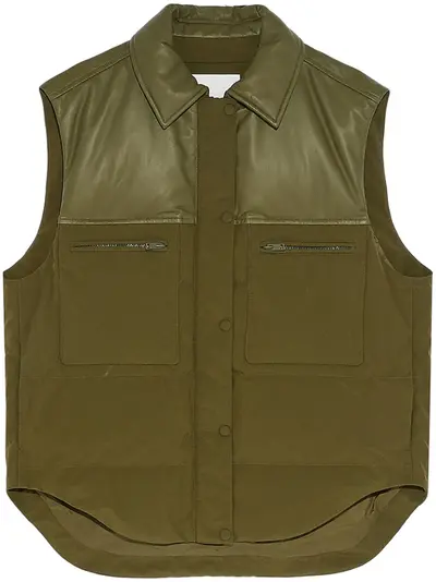 olive green leather panels padded design duck down front press-stud and zip fastening panelled design sleeveless two zip-fastening chest pockets two front welt pockets