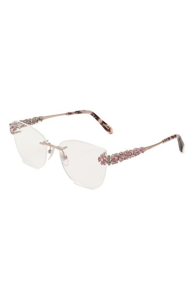 Тонкую безободковую оправу для линз в форме cat eye выполнили из полированного металла с покрытием цвета розового золота. Модель с подвижными прозрачными носоупорами и заушниками из черепахового ацетата украсили на узких дужках цветочной композицией из 78 сияющих кристаллов.
