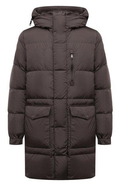 Стеганую куртку из непромокаемого и непродуваемого нейлона утеплили утиным пухом и пером. Модель с капюшоном, тремя внешними и внутренним карманами дополнили лямками, позволяющими носить ее за спиной, как рюкзак. Удлиненный пуховик застегивается молнией, скрытой под штормовой планкой.