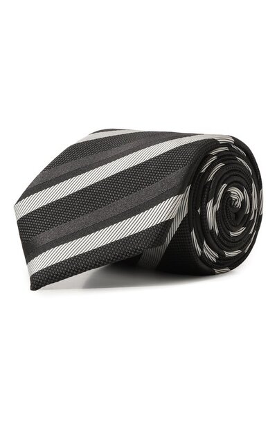 Широкий галстук с контрастными диагональными полосками изготовили из шелкового жаккарда, укрепленного полиэстером. Аксессуар легко драпируется и хорошо держит узел любой сложности.