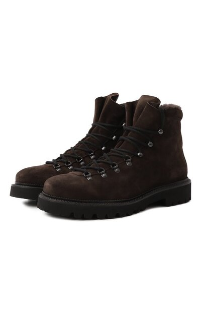 Ботинки S.Moritz утеплили подкладкой из овчины и установили на широкую протекторную подошву, не пропускающую холодный воздух и влагу от земли. Модель с усиленной шнуровкой сшили из замши.