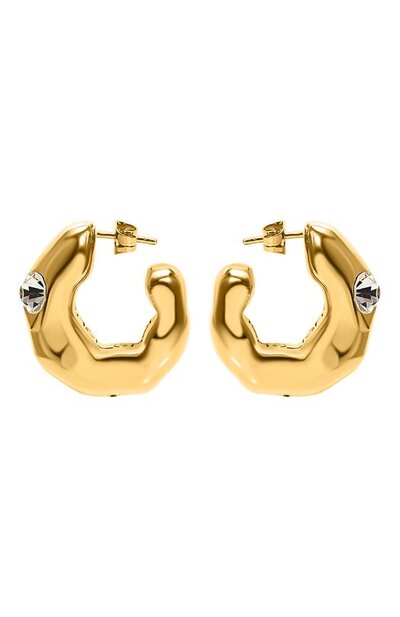 Объемные незамкнутые серьги-кольца скульптурной формы выполнили из бронзы с покрытием из 18-каратного золота. Блеск металла усиливает сияние крупных полупрозрачных кристаллов бриллиантовой огранки. На внутренней стороне модель с застежками пусетами дополнили выгравированным логотипом.