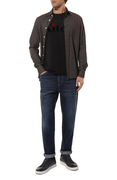 Футболку из хлопкового джерси украсили флокированным логотипом, который зарифмовали с яркими стежками сзади. Наши стилисты предлагают носить модель с джинсами, завершив неформальный образ кедами.