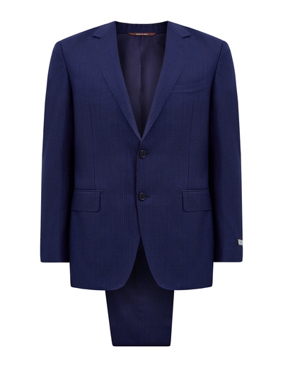 Мужской костюм в классическом стиле от Canali создан из тонкой, гибкой и эластичной шерсти. Поверхность универсального синего оттенка украшена лаконичным микро-узором в клетку. Внутренняя комфортная хлопковая отделка брюк дополнена фирменной символикой, атласная подкладка пиджака из купро — потайными кармашками и монограммой бренда. Застежка пиджака стандартной длины осуществляется на две пуговицы. Сделано в Италии.