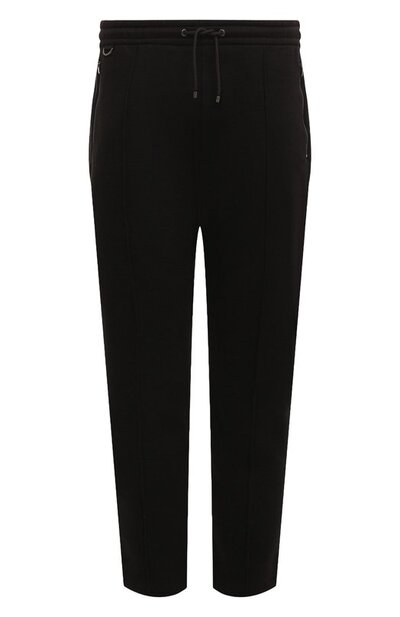 Зауженные брюки сшили из хлопка с добавлением кашемира. По бокам предусмотрели карманы на молнии, а справа расположили D-образное кольцо. Модель с кулиской на широком поясе обходится без застежек.