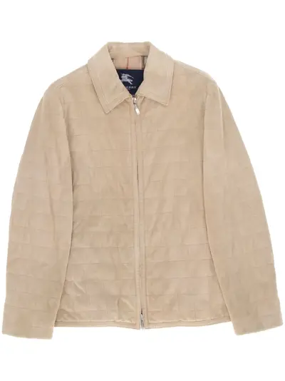 circa 2010s beige suede check pattern spread collar front zip fastening long sleeves straight hem checked lining Condition: GOOD. This previously owned and used item is in good condition with minimal signs of use. This may include fading of material or plating and scratches.