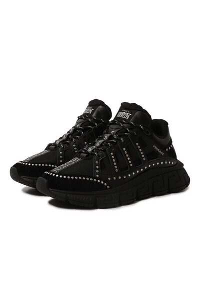 Кроссовки Trigreca декорировали логотипом, миниатюрными заклепками, узором Greca и принтом с координатами Милана. Пару из текстиля и материала, напоминающих гладкую кожу и фактурную замшу, поставили на рельефную амортизирующую подошву.