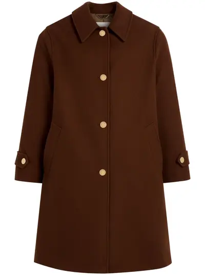 chocolate brown wool gold-tone buttons two side slit pockets belted cuffs detachable collar straight hem