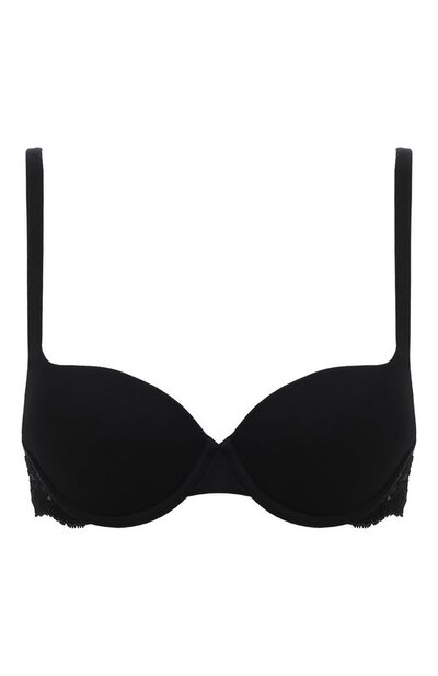 Черный бюстгальтер с плотными чашечками на косточках выполнен из мягкого стрейчевого хлопка, широкий пояс с эластичным кантом — из легкого полупрозрачного тюля с вышитым цветочным мотивом. Узкие бретели, украшенные вытканным логотипом бренда, регулируют посадку и обеспечивают дополнительную поддержку груди. Аксессуар застегивается на два крючка.