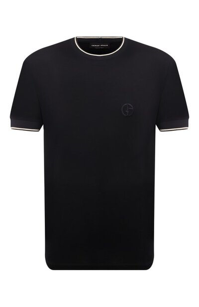Футболку прямого кроя сделали приятнее на ощупь, включив в состав хлопкового джерси нити шелка. В тон темно-синему трикотажу вышили фирменную монограмму, а манжеты рукавов и горловину акцентировали белой полосой.